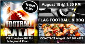 We’re fired up about our annual BBQ at Rowntree Mills Park! This year, Teens and 20s face off in an epic game of Flag Football! Don’t miss it! Call Abigail for details at 647 909 4128!
